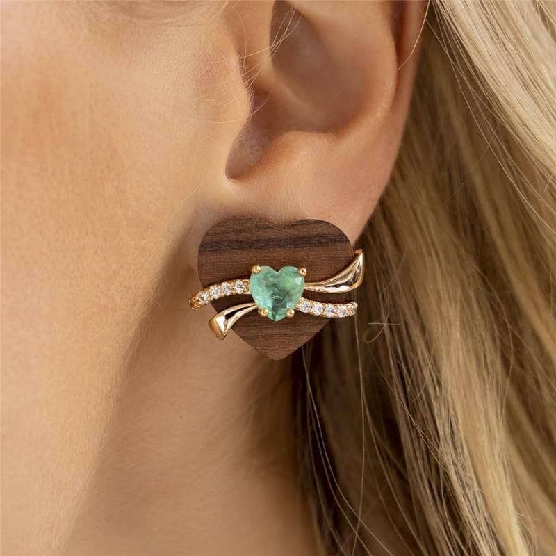 Nesta coleção, apresentamos este deslumbrante e magnífico brinco em madeira de jacarandá banhado a ouro 18k, com zircónias brancas e zircónias ovais na cor esmeralda.